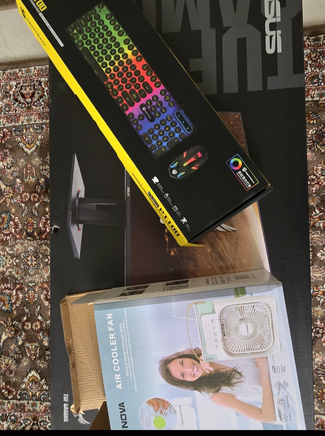هرچی رو میز میبینید اوناییربود که گفتم سفارش دادم هرچیی.کیبوردم نورش رنگی رنگیه خاموشش کردم وایبو بیشتر بگیره😭😂