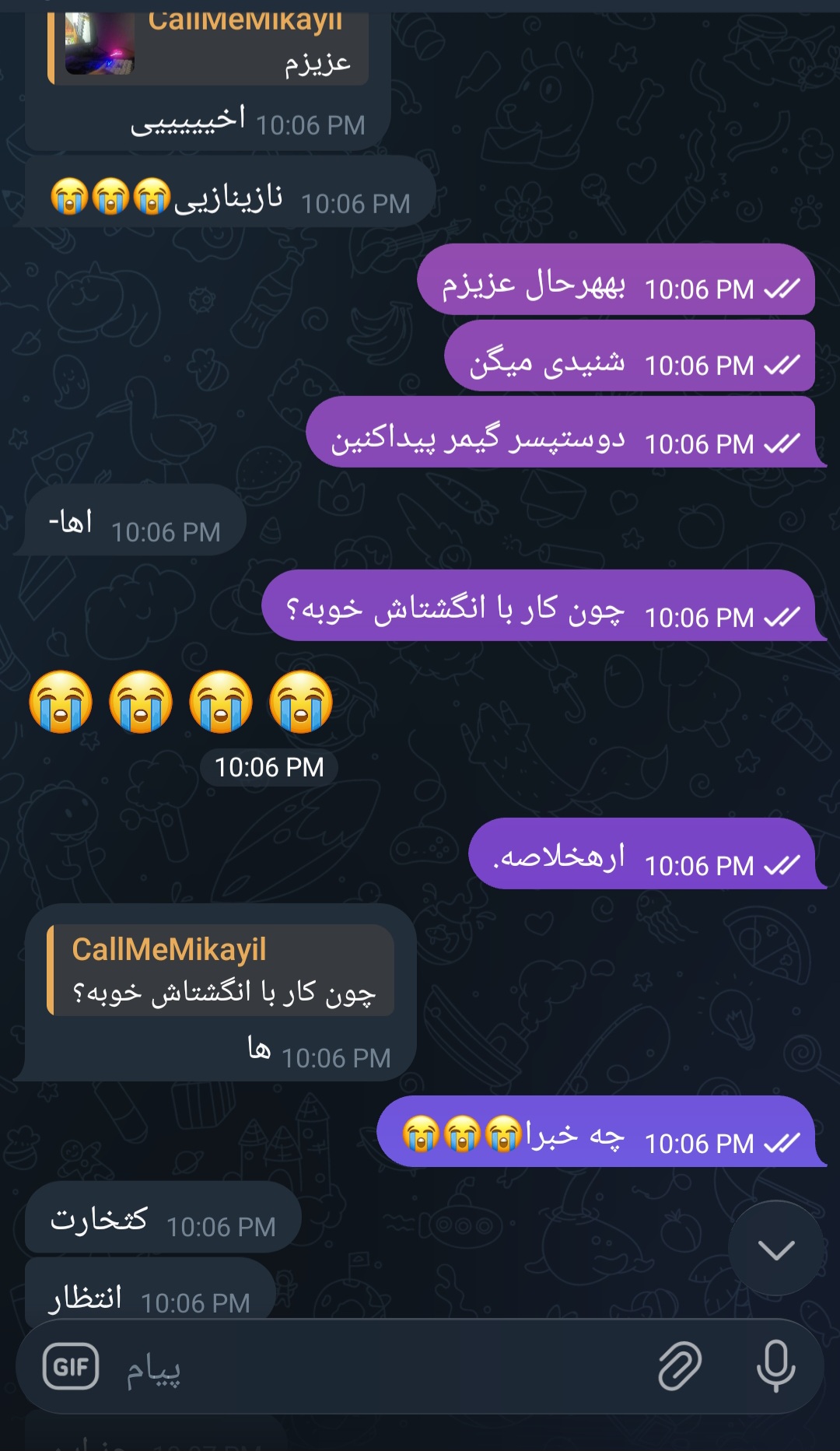 مکالمه عادی ترین مکالمه منو خانم😭😂 2 پسند 6 نظر Arian 22:26 1404/9/18 در حال بارگذاری نظرات... ارسال نظر آزاد است اما میتوانید برای استفاده از امکانات و کسب تجربه وارد شوید. پاسخ به لطفا دوباره تلاش کنید. بارگذاری مجدد نظر ثبت شد.